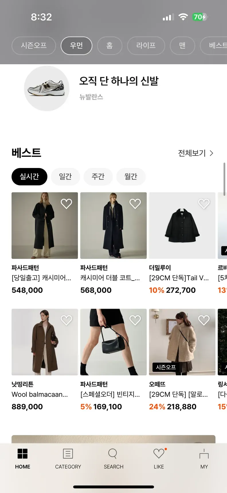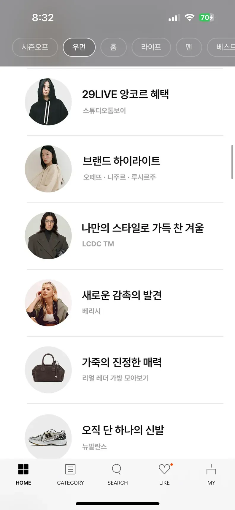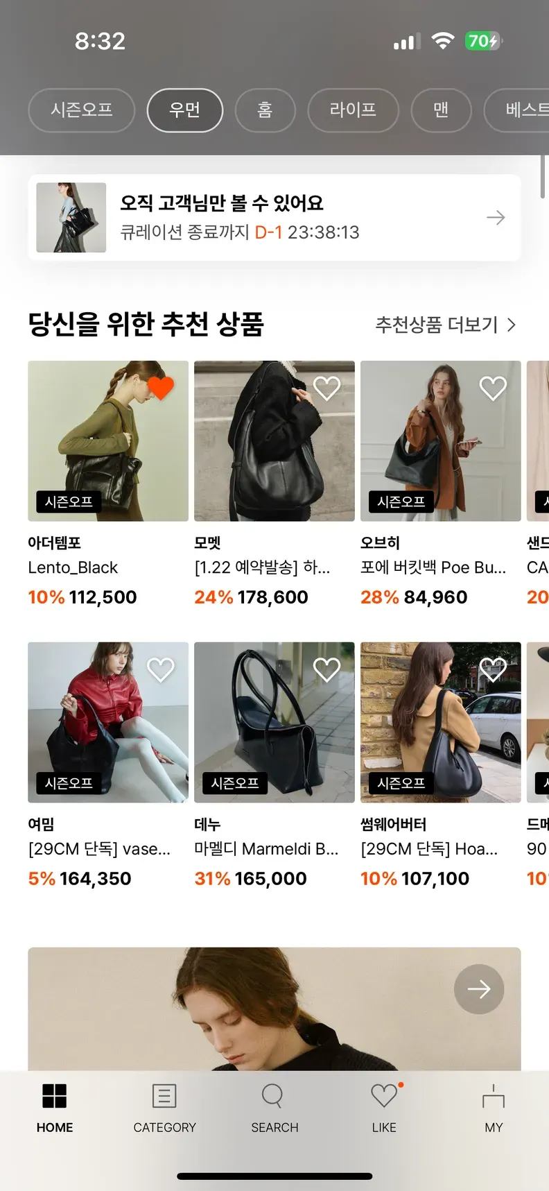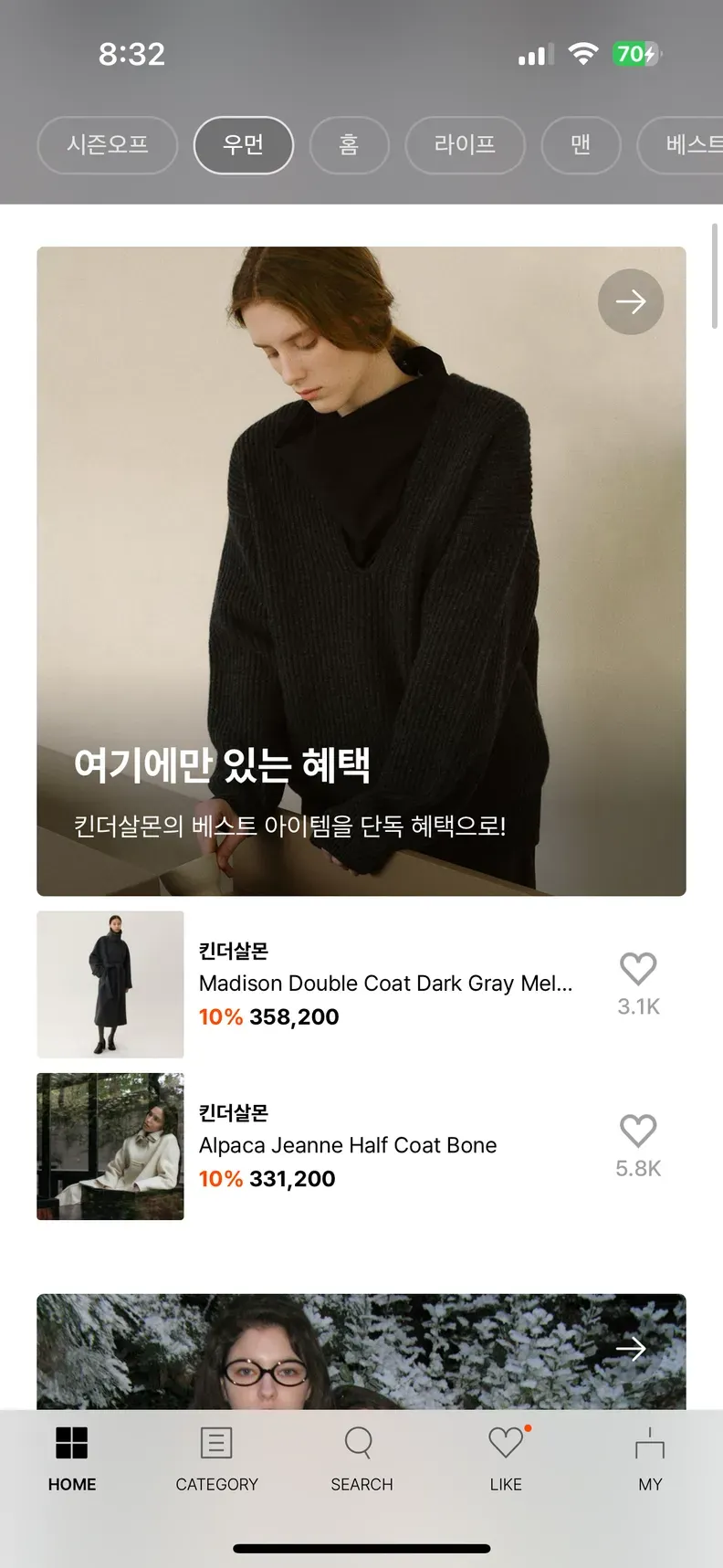 상품이 너무 많고, 홈화면에서 보여주고자 하는게 많다는 생각이 들었습니다. 물론 커머스 특성상 메인화면에서 많은 상품을 노출시켜 소비를 늘리려는 의도는 이해하지만, 과도한 스크롤로 인한 화면에 대한 피로감으로 홈화면을 오히려 대충 보고 넘기게 되는 느낌이 들었습니다.