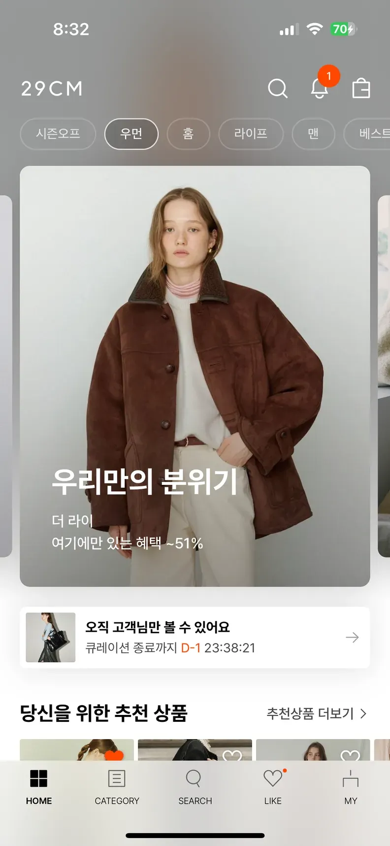 홈화면 메인배너 바로 아래에 사용자가 구경한 상품을 기준으로, 추천상품을 추천합니다. > 이를 통해서 사용자의 구매를 유도하고자 하는 의도가 돋보였습니다.