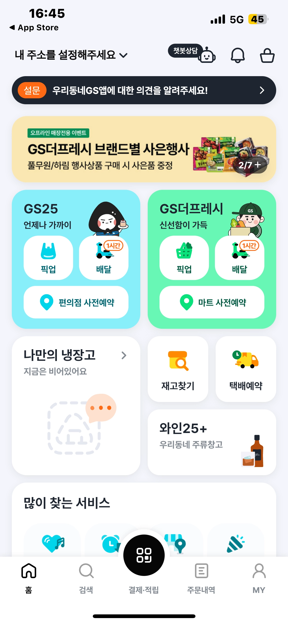 gs25, gs더리프레시에서 픽업, 배달, 사전예약을 할 수 있는 앱이다. 와인25플러스 사용으로 주류 관련 서비스 이용도 가능