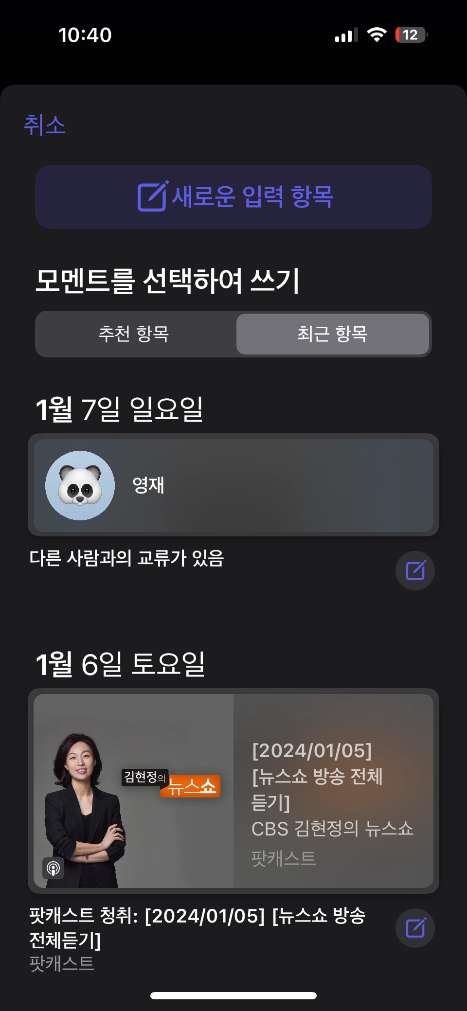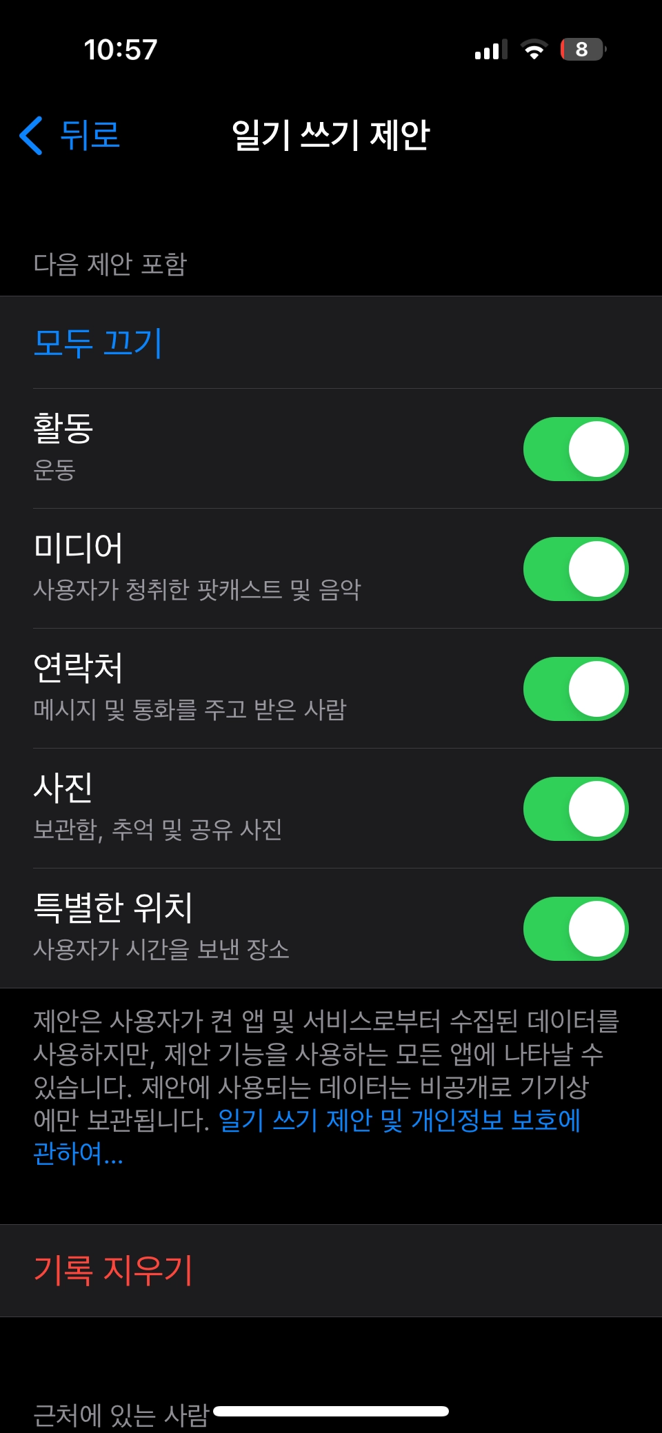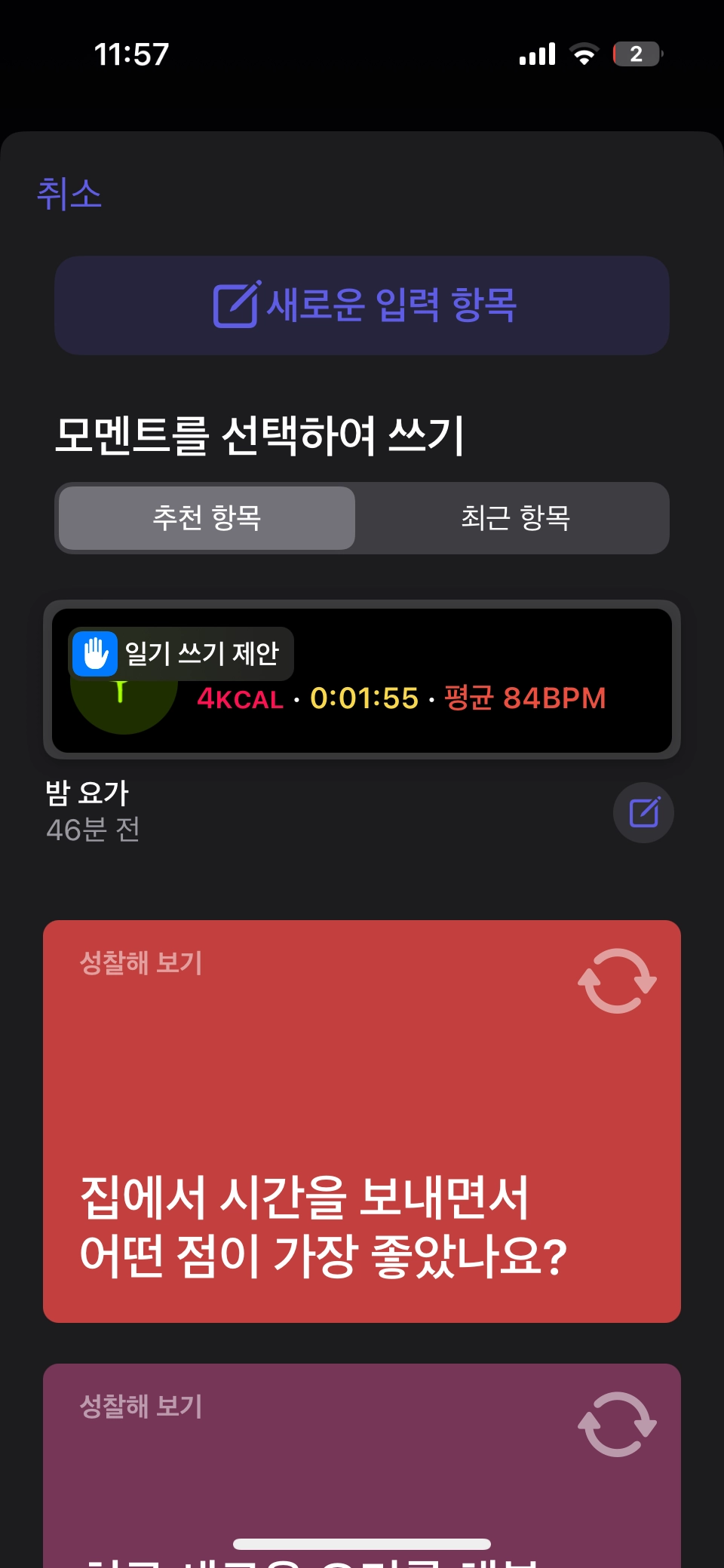 : 현재는 활동(운동)/미디어(팟캐스트 및 음악)/ 연락처(메시지 및 통화 기록)/사진(보관함 및 추억)/특별한 위치 5가지 항목 기반으로 일기 거리를 제안해주는데요. 더 다양한 앱 데이터를 결합해 글감을 제안해준다면 더 풍성하게 하루를 복기할 수 있을 것 같습니다.