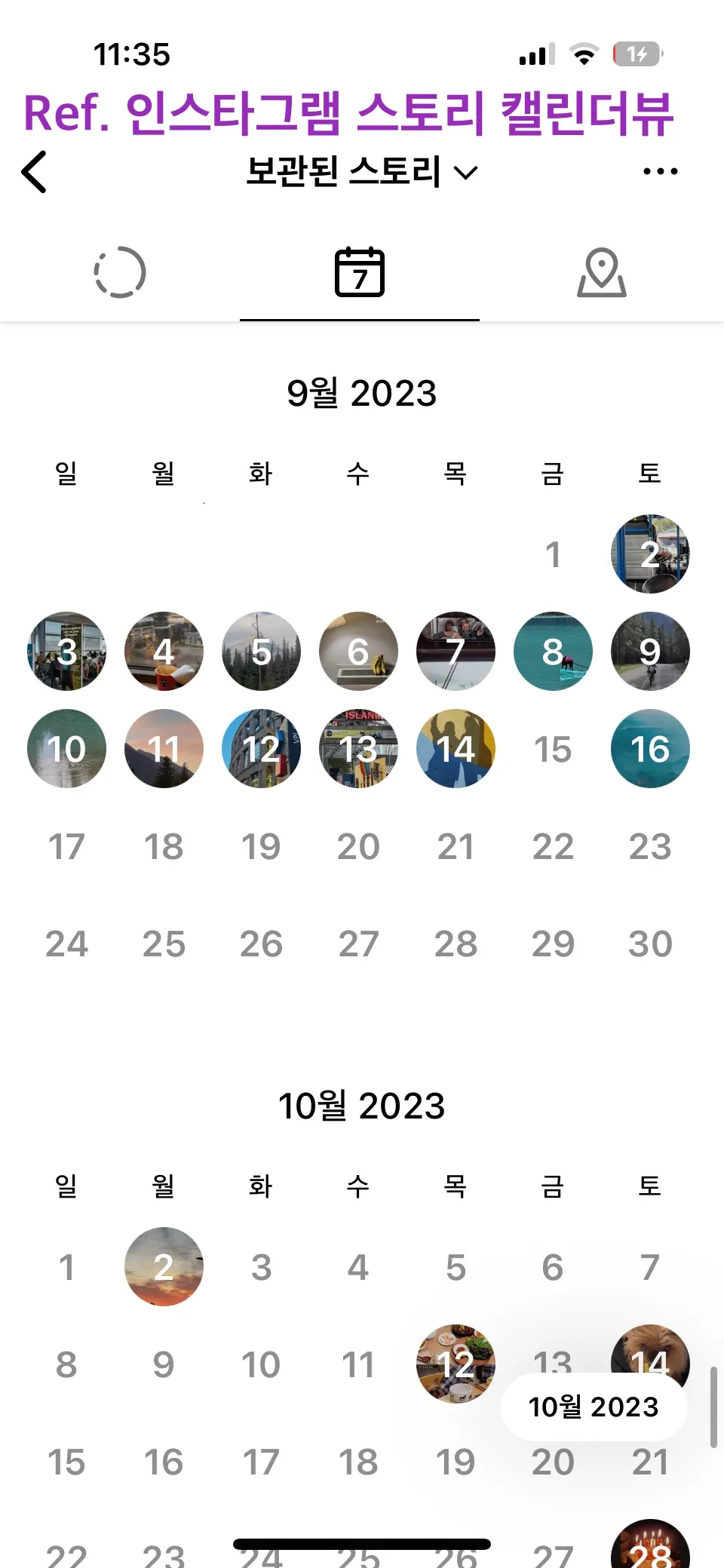 Ref. 인스타그램 스토리 보관함 보기 형태 중 캘린더형을 참고해도 좋을 것 같습니다 (일기를 쓴 날은 이미지/색상 등으로 캘린더에 표시하고, 해당 일자를 선택하면 그 날 쓴 일기로 이동)