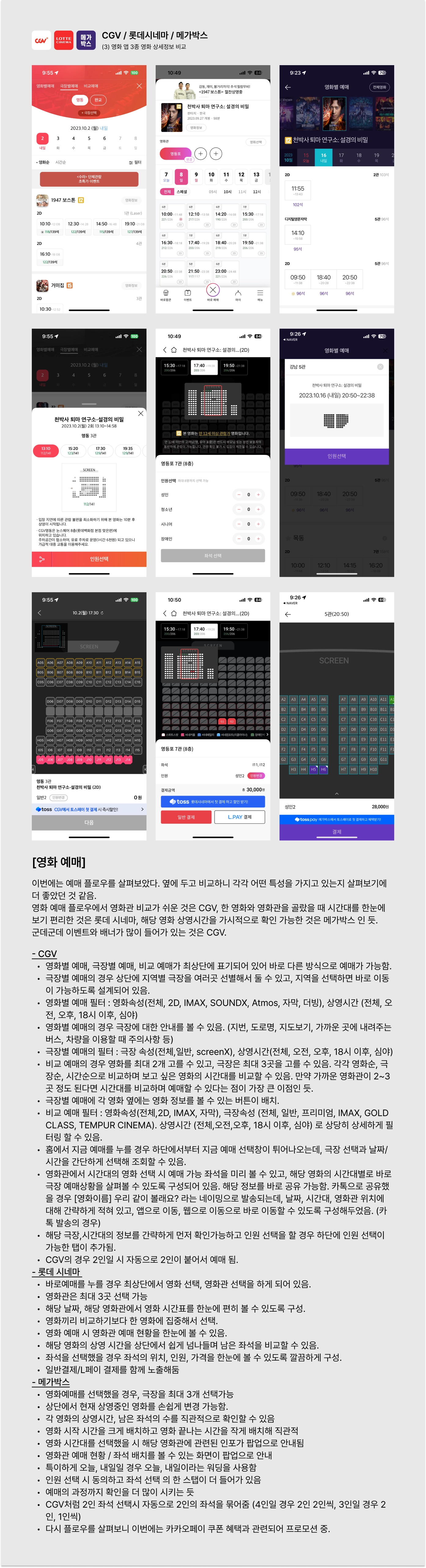 영화 예매 플로우에서 영화관 비교가 쉬운 것은 CGV, 한 영화와 영화관을 골랐을 때 시간대를 한눈에 보기 편리한 것은 롯데 시네마, 해당 영화 상영시간을 가시적으로 확인 가능한 것은 메가박스 인 듯.