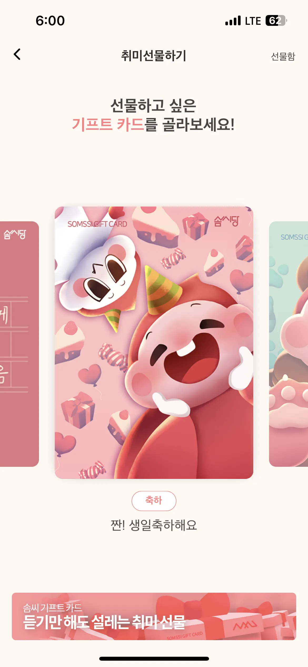 2) 카테고리부분에 '선물하기' 에서 다양한 스타일의 카드 디자인 (취미 상품권을 선물 할수 있는게 아이디어가 개인적으로 좋았습니다.)