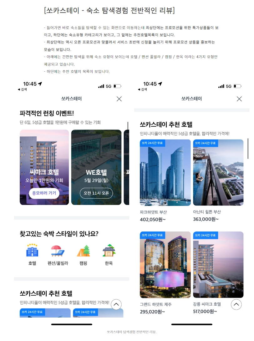 모텔 등 유형의 숙소를 아직 확보하지 못한 것일지 혹은 일부로 진출을 안한걸지 확실하지 않지만 저는 전자라고 생각합니다. 소카의 이미지를 다른 숙소앱과 다르게 만들어가려는 의도도 포함되어 있을 것 같고, 넷다 각자의 '낭만' 이나 '로망'을 자극하는 유형의 숙소가 아닌가 생각합니다. 특히 '한옥'이라는 카테고리가 포함되어 있는것이 인상깊었습니다.
