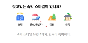 아래에는 간편한 탐색을 위해 숙소 유형이 보이는데 호텔 / 펜션 풀빌라 / 캠핑 / 한옥 이라는 4가지 유형만 제공되고 있습니다.
