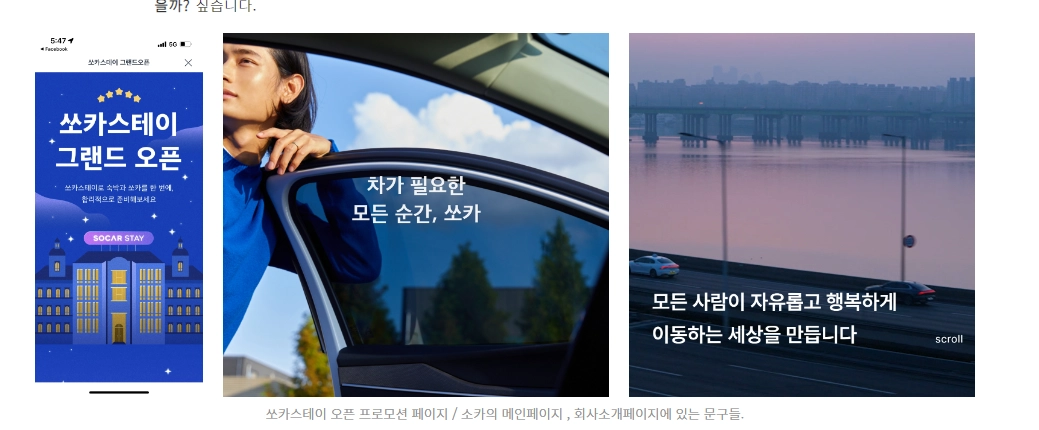 단순히 렌트카를 넘어서 사업을 확장하려는 시도로 보입니다. 소카의 메인페이지에 있는 '차가 필요한 모든 순간' 이라는 문구와도 잘 어울리는 것 같은데, 차를 렌트해서 다양한 공간으로 이동하고 여행지에서는 숙소로 이동하기 때문에 숙박까지 같이 확장을 해도 그리 어색한 것 같지는 않습니다!