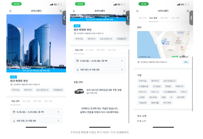 그리고 다른 정보들도 "숙소 정보" "예악 정보" 로 심플하게 구성되어있습니다. 추후에 리뷰 등도 추가될 것으로 보이지만 아직은 심플해 보였고 예약을 위해 어떤 호텔이고 어떤 방이있는지 접근성이 더 높으면 좋겠다는 생각을 했습니다! 그리고 추천호텔들이 있는데 요것들만이라도 프로모션 페이지를 구성했으면 어떨까?생각도 들었습니다.