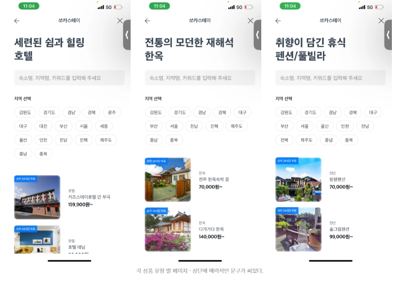단순히 해당 유형의 상품들만 모아둔 것 (EX- 한옥들만 모아두기) 이 아니라, 상단에는 각각의 카테고리에 맞는 문구가 배치되어 있습니다. 예를들어 한옥 카테고리 상단에는 '전통의 모던한 재해석 한옥' 이라는 문구가 적혀있습니다. 각 카테고리 별 매력도를 높이려는 의도로 보입니다.