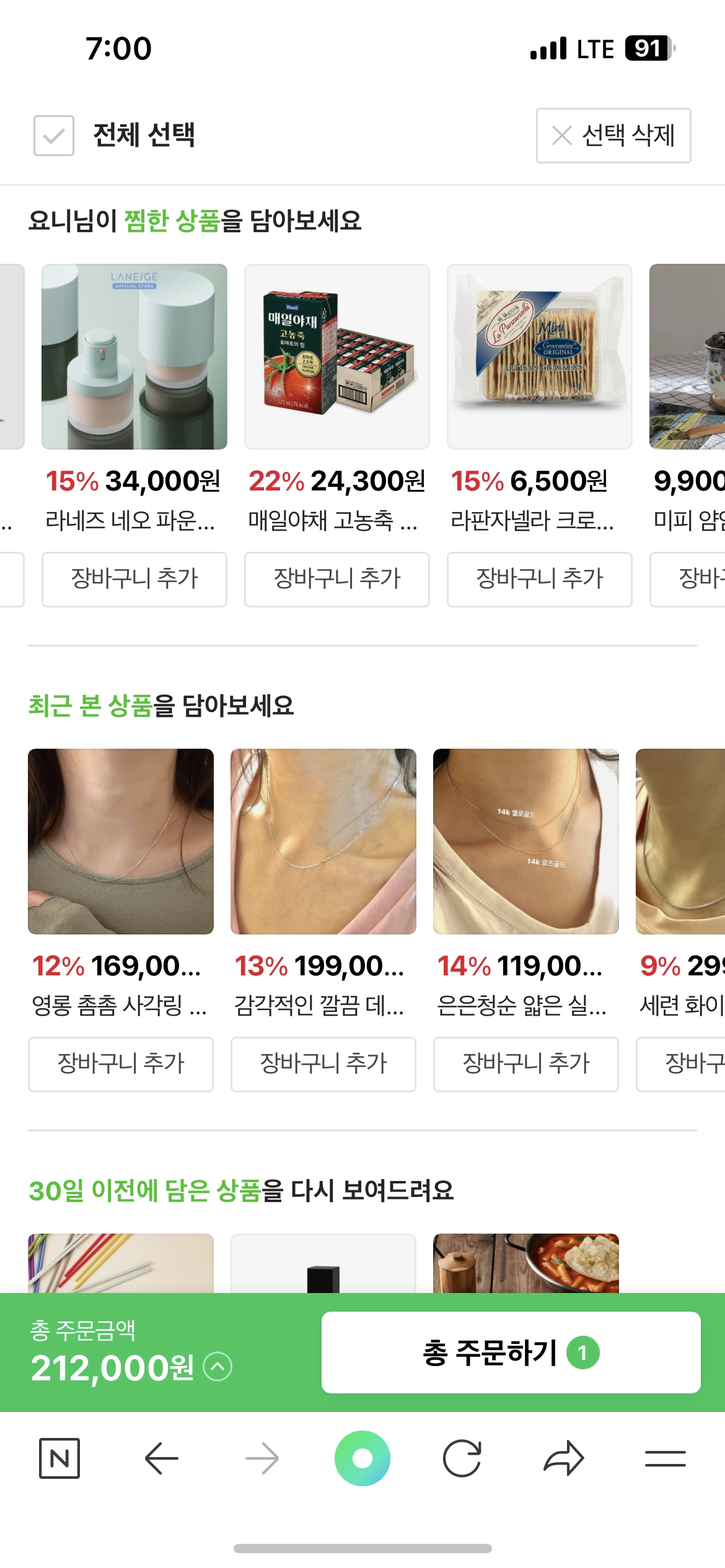 찜한 상품, 최근 본 상품, 30일 이전에 담은 상품