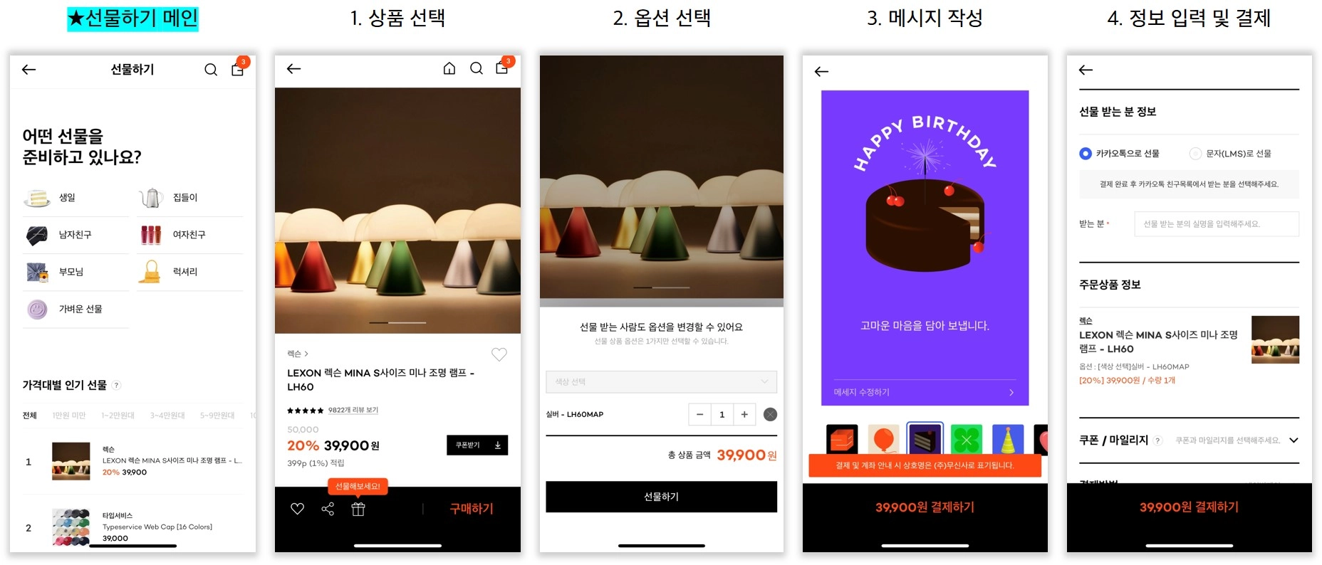 디테일한 UIUX가 가장 돋보이는 서비스였습니다! ‘친구에게 선물하기’ 같은 친절한 문구, 메시지 유도 문구, 다양한 카드 디자인, 정보 입력 단계에서 선물 수신자 변경 가능 등 가장 다양한 기능을 제공하고 있었습니다.