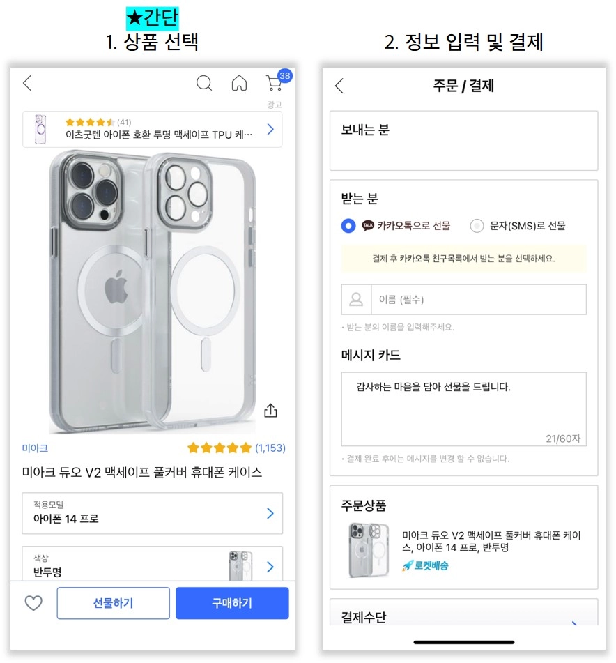 서비스가 워낙 간단하여 비교적 눈에 잘 띄지 않았습니다. 구매하기 버튼이 강조되다 보니 선물하기 버튼은 눈에 띄지 않고, 선물하기 로직도 구매하기와 비슷하여 서비스 첫 이용 시, 오히려 장벽이 있을 것이라 생각되었습니다.