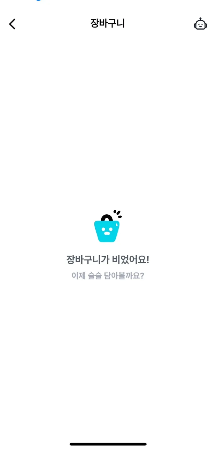 장바구니에 상품이 담겨있지 않은 경우 ‘장바구니가 비었어요! 이제 슬슬 담아볼까요?’ 문구만 확인된다.