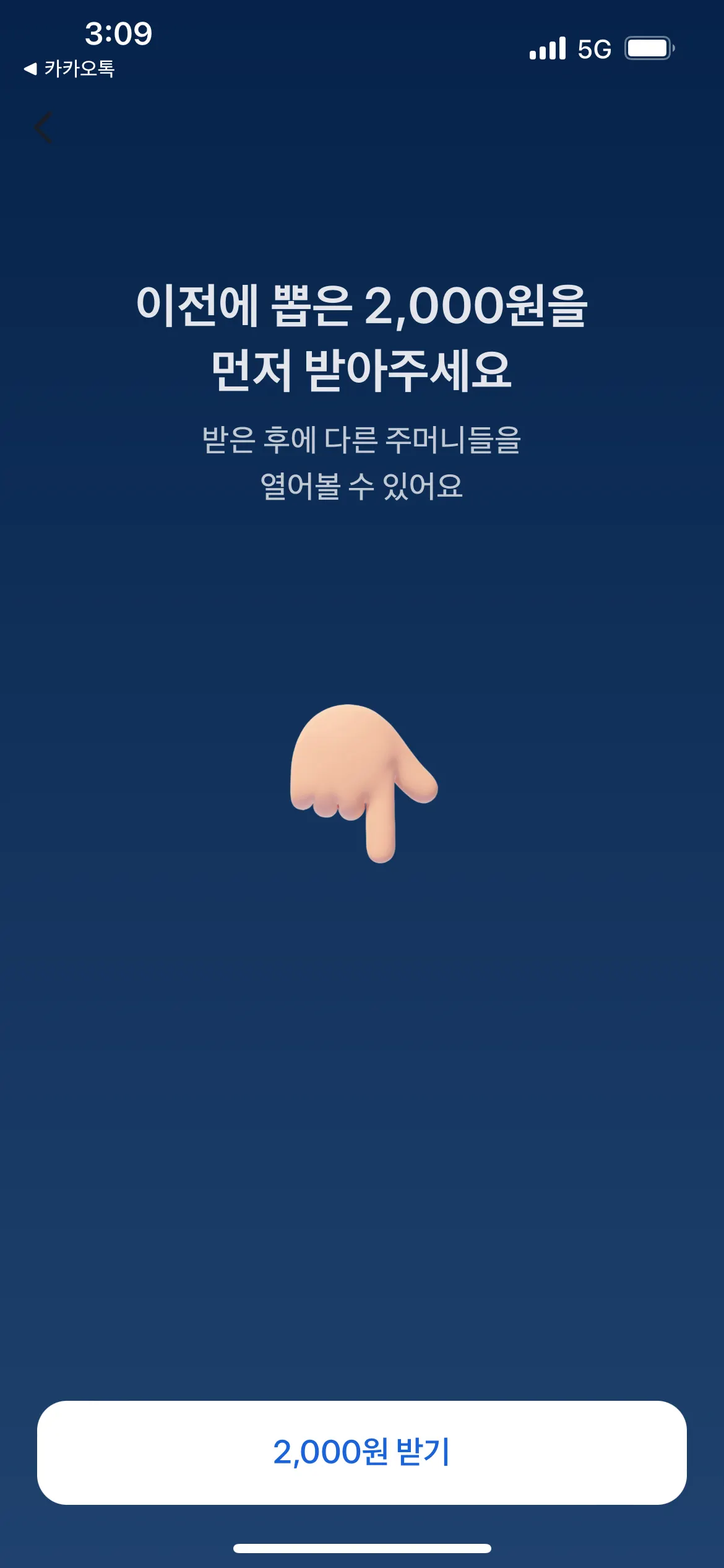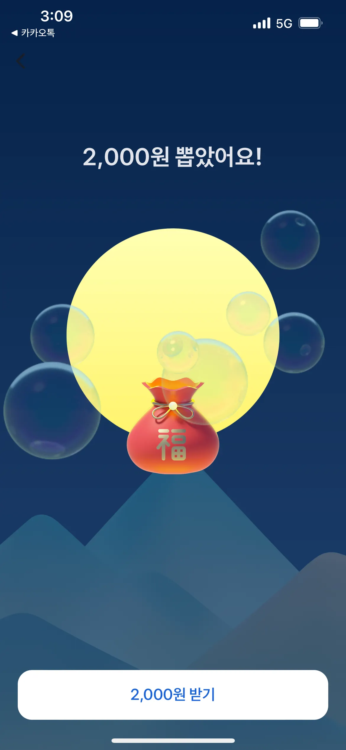 카카오톡 채팅방 등에서 공유된 복주머니를 열면, 재밌는 인터렉션과 함께 받은 돈이 보여요! 맨처음에는 오..? 2천원이라니 엄청크네! 싶었는데 토스뱅크 계좌개설과정으로 이동하는 것을 보고 의도를 이해했습니다.. ㅋㅋㅋㅋ