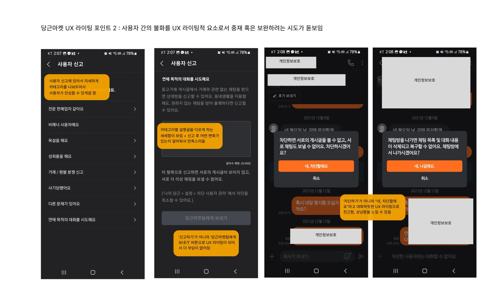 '신고하기' 버튼이 아니라, '당근마켓 팀에게 보내기'라고 명칭하면서 신고에 대한 부담감을 줄여줌