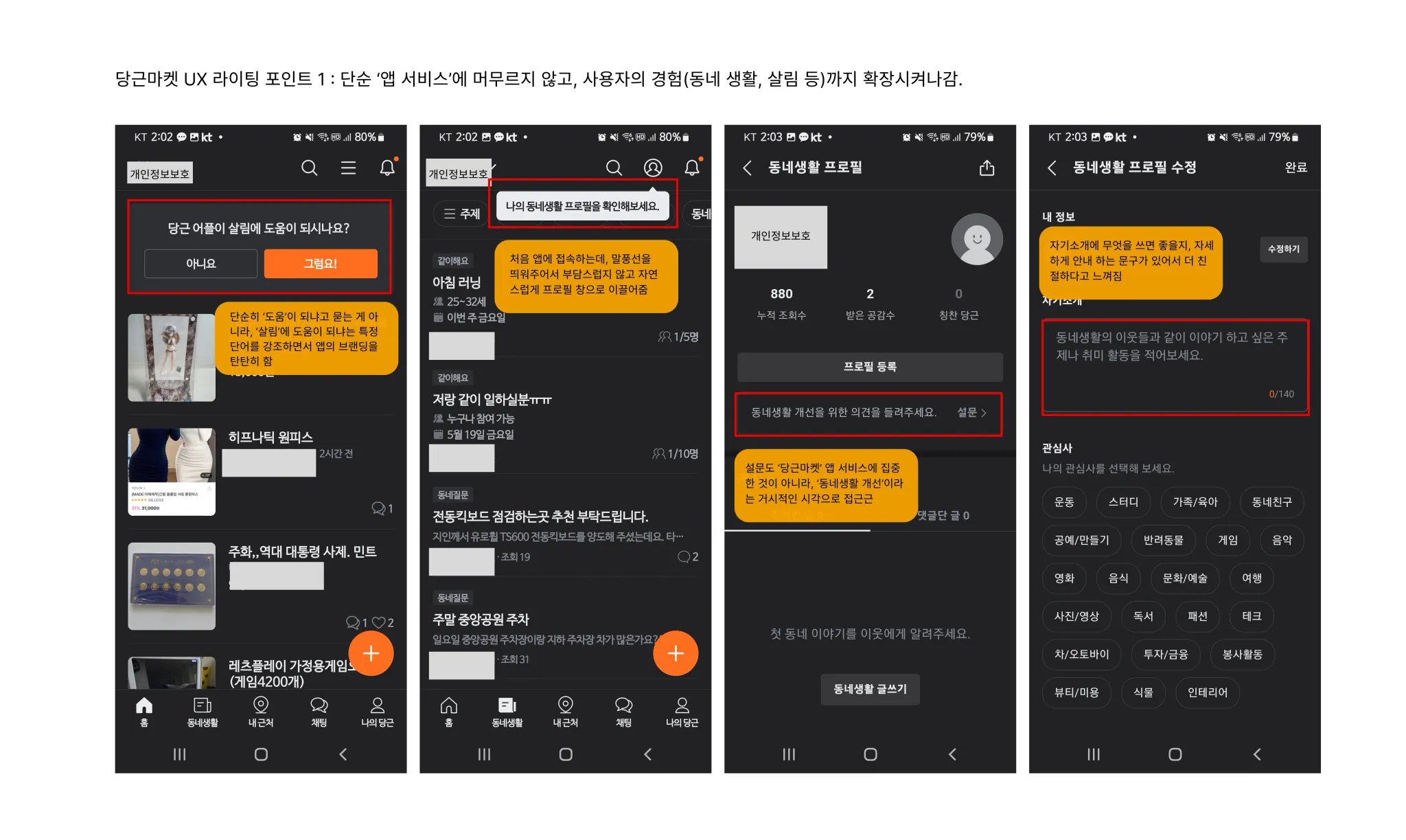 중간마다 '프로필'이 아닌, '동네 생활 프로필' / '당근마켓 앱 서비스 개선'이 아닌, '동네 생활 개선' 등 당근마켓을 사용하는 것이 곧 동네 생활을 하는 것이라는 인식을 워딩을 통해 인지시킴