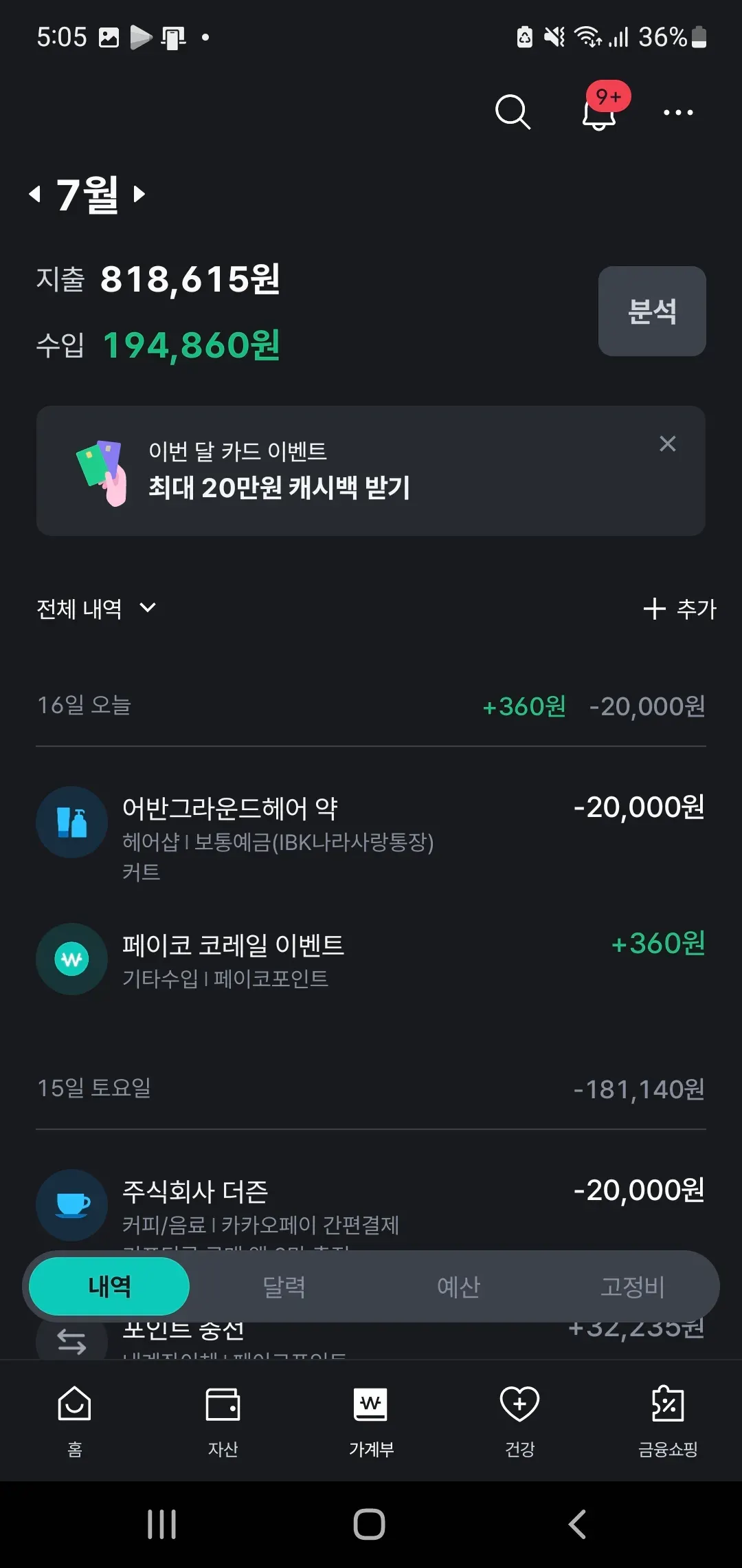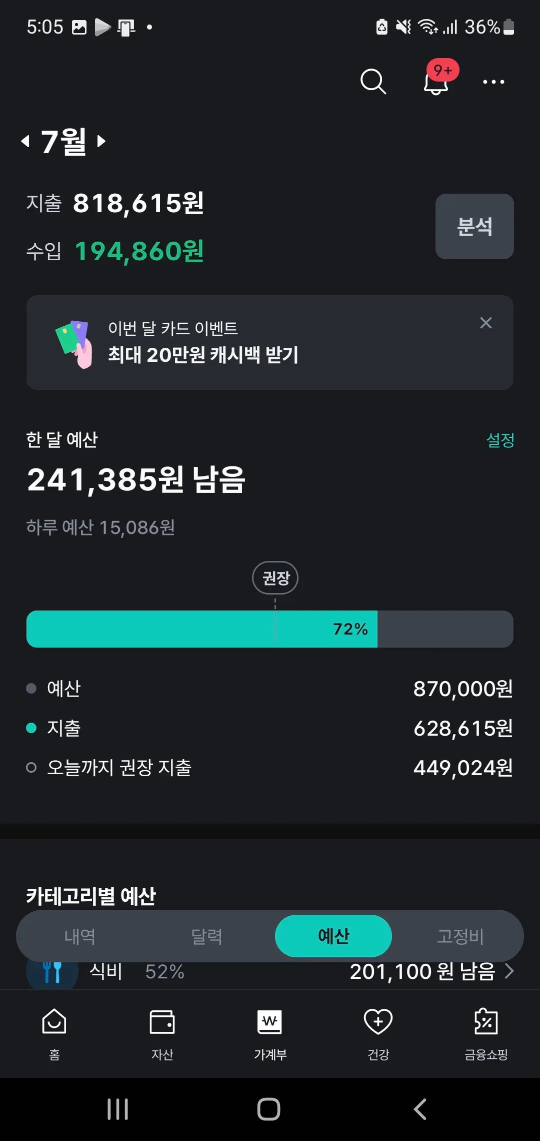 2. 뱅크 샐러드 : 뱅크 샐러드를 많이 이용할 수 있는 이유이기도 한 가계부 서비스가 큰 장점입니다. 토스와는 달리 예산을 설정하고, 가계부를 작성할 수가 있습니다. (제가 토스에서 예산 설정을 못찾은건 아니겠죠...?) 절약을 하며 예산 내에서 소비를 하고 싶은 유저의 입자에서 토스는 예산을 설정을 할 수 없어서 아쉬움이 있습니다. 저는 전체적인 소비나 잔고 확인, 이체 등의 가벼운 활동은 토스를 사용합니다. (기존 사용해온 익숙함과 훨씬 더 한눈에 쉽게 들어오는 이유) 하지만 가계부 이용은 뱅크 샐러드를 이용합니다.
