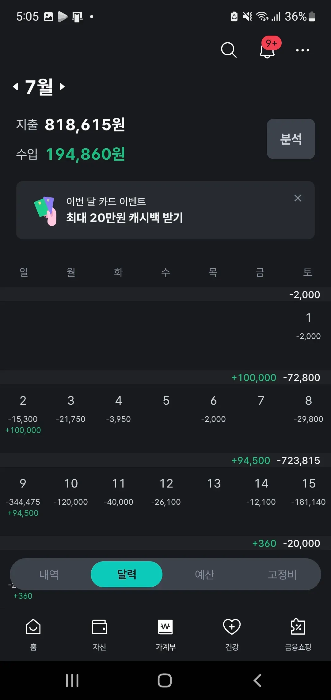 3. 뱅크 샐러드 : 달력으로 볼 시 일주일에 대한 소비와 수입을 보여줍니다. 이 점 또한 가계부를 이용하는 유저에게 편리한 기능을 제공합니다. 이러한 부분에 있어서 각각 메인 유저 타겟의 성향이 조금의 차이가 있어서 이러한 서비스의 차이점이 있지 않을까 생각됩니다. 그러한 이유에서 토스는 좀 더 심플하지만 명확한 정보 전달과 뱅크샐러드는 토스에 비해서는 조금 덜 심플하지만, 필요한 추가적인 정보를 제공하기에 저와 같이 간단 서비스는 토스, 상세 가계부 작성은 뱅크 샐러드를 이용하는 것 같습니다.